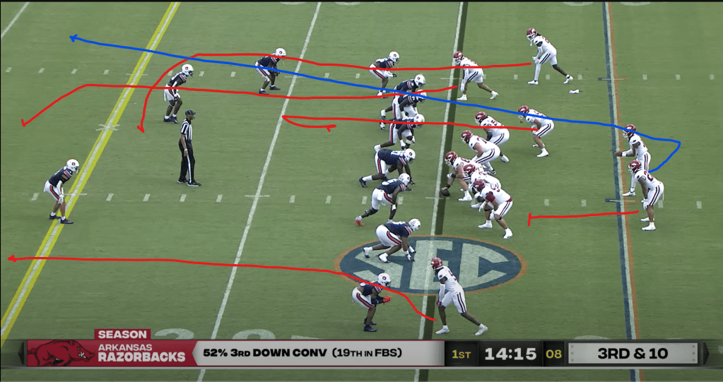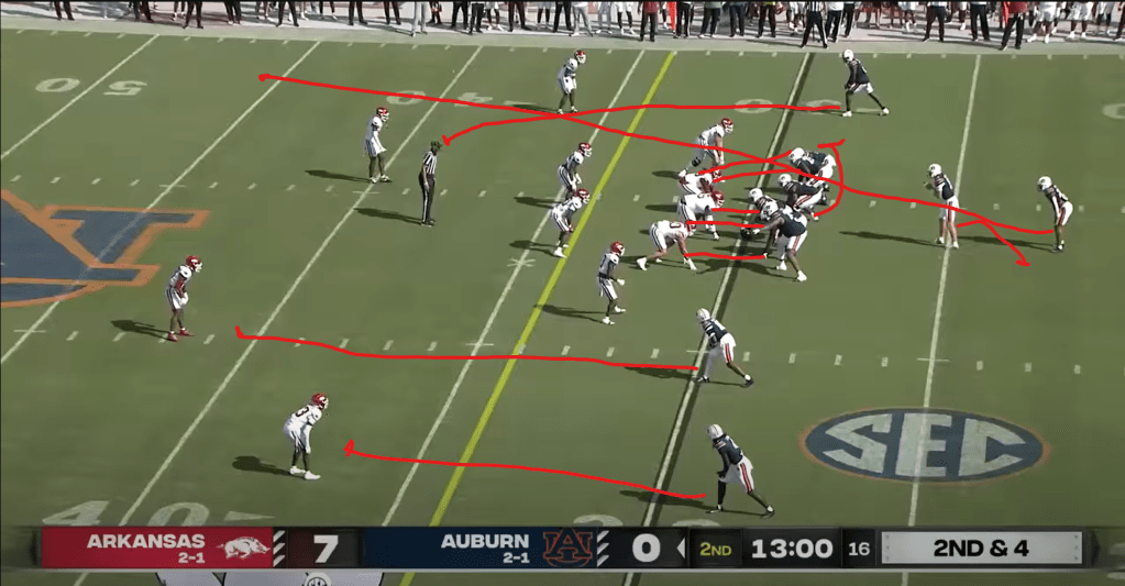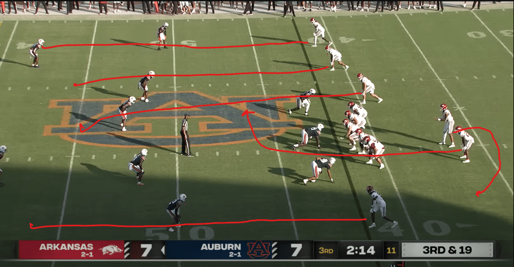 Another issue Auburn’s offense suffered from under Hugh Freeze was the lack of a real quick passing game. In the modern era, many teams have folded their quick game into their RPO concepts, which makes sense; there’s no need to run hitches, slants, or quick screens if they’re already built into your run game. However, Freeze’s offenses also lacked any kind of real underneath passing game, like stick, snag, or shallow crossing concepts. These kinds of plays are important for controlling the second level defenders and keeping them from teeing off on your QB, as often happened to Jackson Arnold. Even Auburn’s deep passes tended under Freeze tended to lack any real underneath option, which was part of the reason Arnold ended up eating so many sacks.