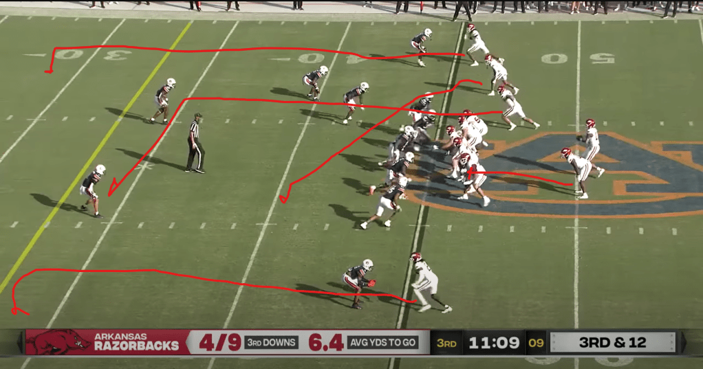 On the first play of the fourth quarter, Auburn finds itself in a familiar spot: third and long. In desperation mode, Auburn lines up in a 3×1 set and goes with another old Mike Leach staple: four verts (“6” in air raid terminology). This is exactly what it sounds like: all four receivers run vertical routes with the back check-releasing. Generally, receivers are told to win deep, and if they can’t, to put their foot in the ground to allow a back-shoulder throw, which happens here.