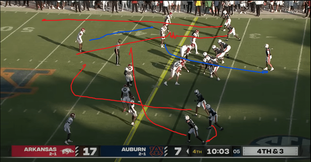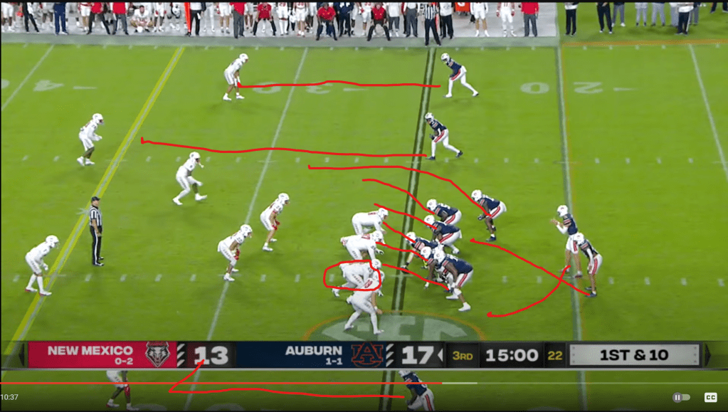 The next play in this series includes another RPO action, but also another subject I didn’t really touch on in my last post (mainly because the QB competition was still ongoing): the QB run game. Of course, when Auburn fans have talked about the QB run game going into this season, they’ve mainly been talking about Robby Ashford, but here Auburn gets Payton Thorne involved in the run game too, just to keep the defense honest. This is basically the simplest RPO there is: the RB motions out of the backfield, and the QB just looks to see if a defender follows him. If nobody follows him, the defense is probably in zone and the offense should have numbers to block the swing route on the perimeter; if a defender follows him, the defense is probably in man and the offense should have the numbers to block the box defenders. The LB follows the motion, so Thorne recognizes the defense is in man and carries up the middle on the draw for a first down.
