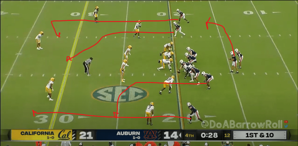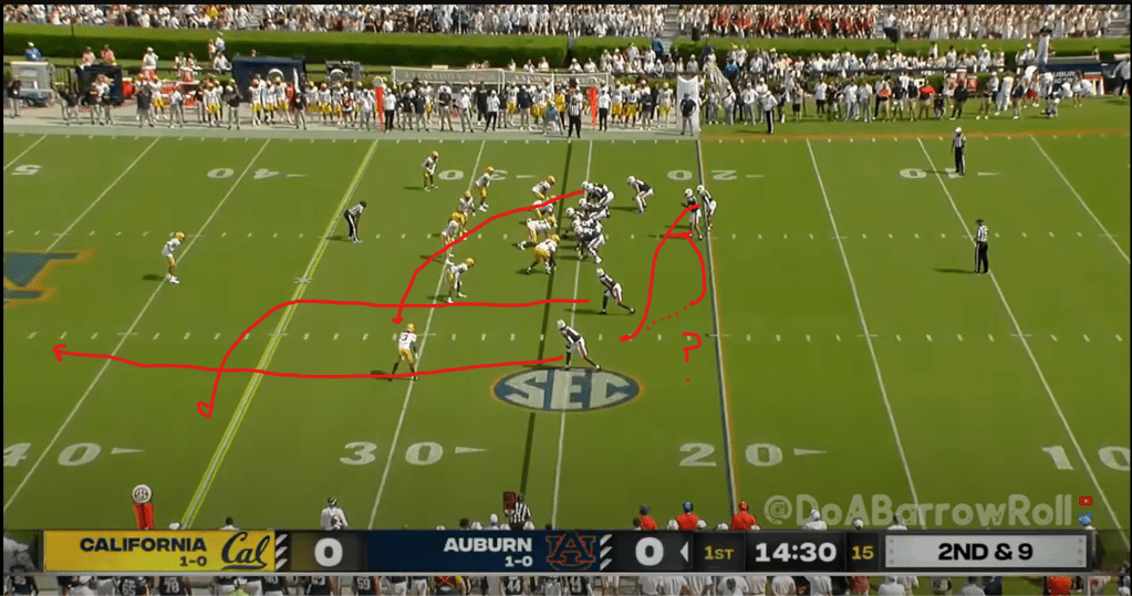 After, and stop me if you’ve heard this one before, a missed Cal field goal attempt, it’s Robby time yet again. In this case, it’s actually a good play design for getting the QB involved in the run game and it works pretty well. Auburn lines up in a pistol set and runs GT counter with what’s known as a bash scheme. “Bash” is derived from the abbreviation “BA” or “back away”, which means that the offense will fake the RB carrying the ball to one side and then run away from that side with the QB. This isn’t really new (it was a staple for Gus Malzahn a decade ago and my high school was running it in the mid-2000s), but it’s a good way to attack a defense that shifts the defensive line over toward the RB. Robby fakes the sweep to Jeremiah Cobb and then runs the counter with Damari Alston leading for him and it’s a successful run on first down.