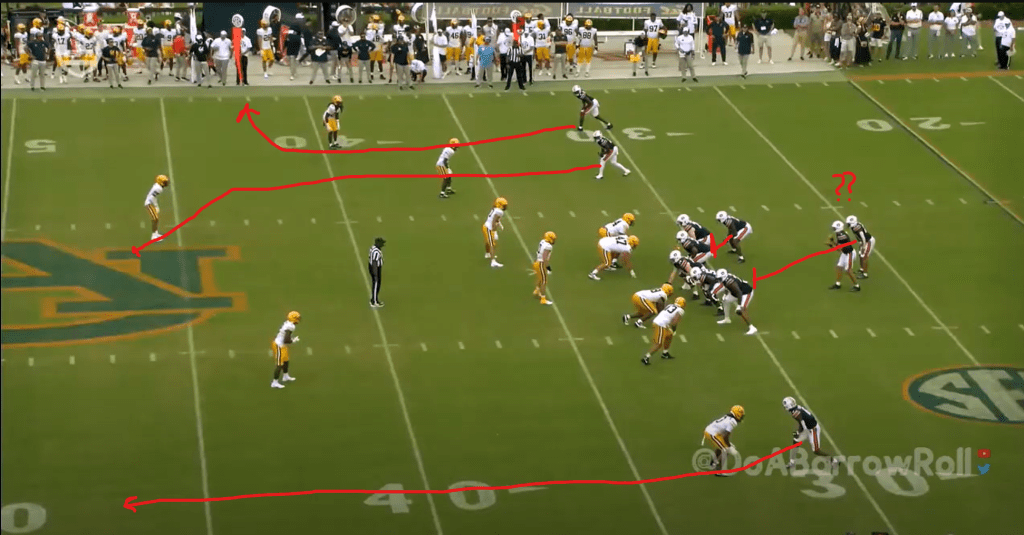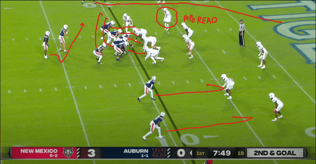 Auburn’s RPO game was often ineffective under Hugh Freeze. Part of the reason was that Jackson Arnold’s hesitancy and indecision made him a bad RPO QB, but part of it was the lack of any sort of real downfield RPO threat to constrain the second and third level defenders. There were intermittent flashes where Hugh Freeze’s offense did this well (check out my writeup on the Alabama A&M game last year for a good example) but those occasions were few and far between this season.