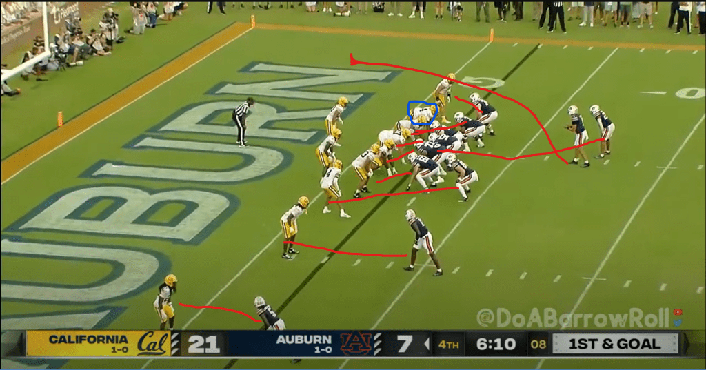 And now we get to see the other side of that sword. On the second of these two drives, Cal made its way down to the Auburn red zone, but found itself in a third and 10. I’m not entirely sure what Cal is running, maybe some type of smash concept with a jerk route in the middle? In any case, it doesn’t really matter. Auburn brings the house, with six rushers; although Cal has six pass blockers, the RB totally whiffs on Eugene Asante coming off the edge, and he takes Jackson down for a huge loss, setting up a field goal which Cal missed.
