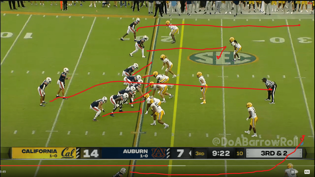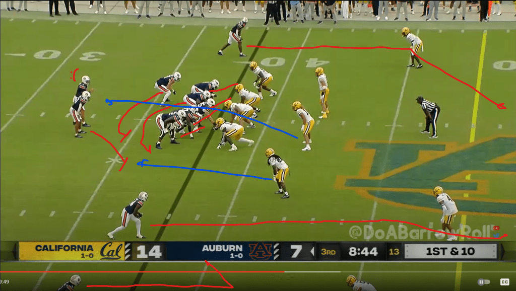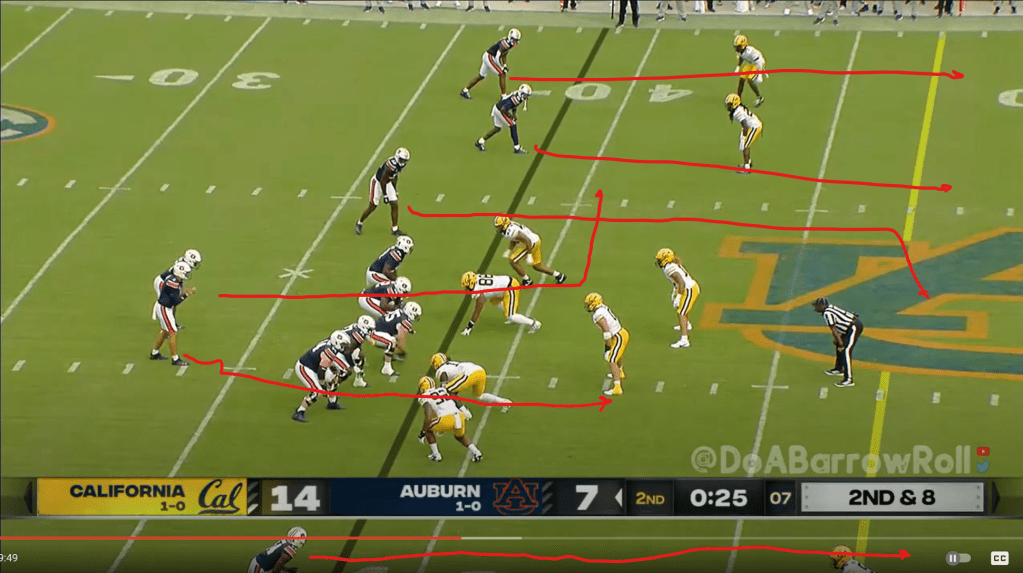 Following another excellent defensive stand and the first of many missed field goals by Cal, Auburn’s offense briefly showed a bit of a pulse on its next possession. On second and 5 from their own 30, Auburn uses one of the options I mentioned above to counteract a defense that’s determined to play man and keep +1 in the box: getting the QB involved in the run game. Obviously Payton Thorne isn’t Robby Ashford, but he’s fast enough to do what you need him to in this situation: pull the ball and get five yards if the defense gives it to you. This is a basic zone read with the TE arc blocking the run support player on the perimeter; the DE pinches, so Thorne pulls it and gets an easy first down. (Note, however, that Cal actually wasn’t in man here; this looks like some type of Cover 3 match.)
