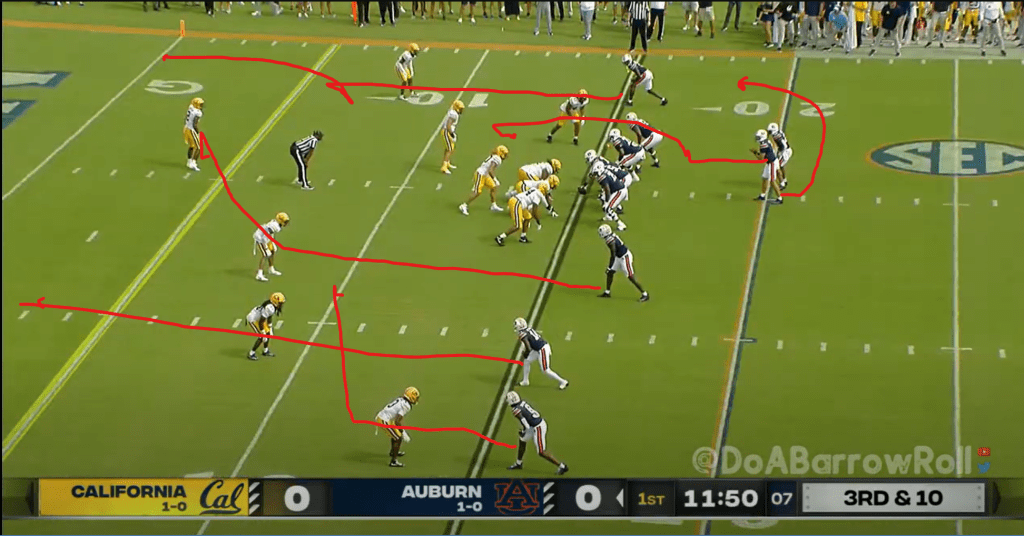 After Damari Alston’s fumble, Cal finally found a way to generate a couple of explosive plays with their second QB, Sam Jackson V. This drive saw some of Auburn’s bad tendencies from the UMass game rear their ugly heads again. On this play, the Tigers only rush four and are unable to get pressure with Cal basically in max protection, leaving Jackson time to find an open receiver downfield.
