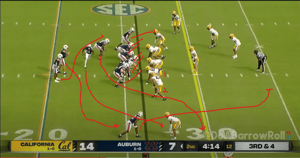 So, what do? In this situation, there are a few possible solutions. The first is to just beat them in man coverage, but as we’ll see, Auburn’s receivers struggled to do that. The second is to run pass concepts that are designed to attack man coverage, which we’ll discuss later. Finally, you can involve the QB more in the run game, which will equalize the numbers in the box and allow you to run the ball again.