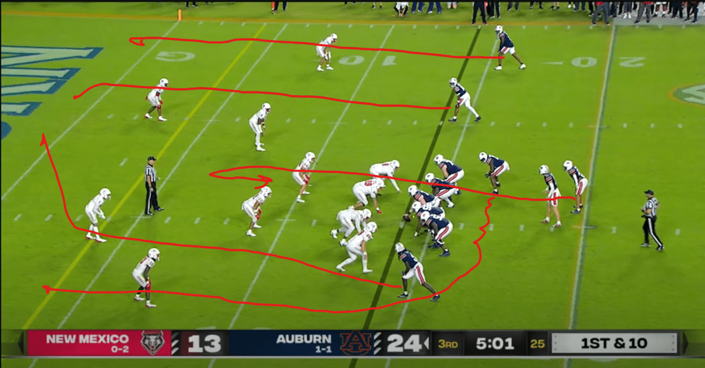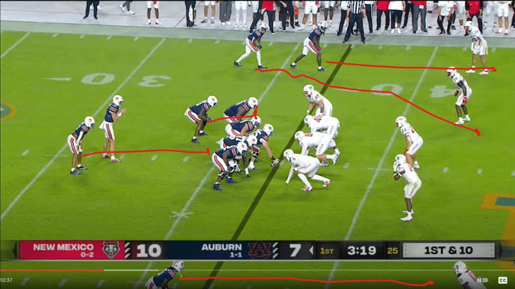 Derrick Nix signaled his intention to bring that aspect of Auburn’s offense back from the very first offensive snap of the game. Auburn starts in a compressed formation with Eric Singleton, Jr. aligned in a way that suggests he’s probably going to go in jet motion, which he does. Auburn runs a power read concept here, originally brought to national prominence by the 2010 Auburn offense.