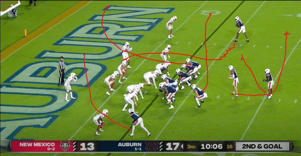 Nix also utilized Daniels’ legs on a few straight QB runs. Auburn’s second touchdown of the night came on a QB power play, with Daniels taking it to the house from 11 yards out. This is the same blocking scheme as the power read play above for the offensive linemen, but now the tight end will kick out the defensive end like a normal power concept. Usually the RB would be used as an additional lead blocker, but he just kind of wanders outside here. I’m not really sure what he’s doing to be honest, but whatever it is freezes the playside linebacker long enough that he’s an easy mark for the pulling guard, whose block springs Daniels for the TD.