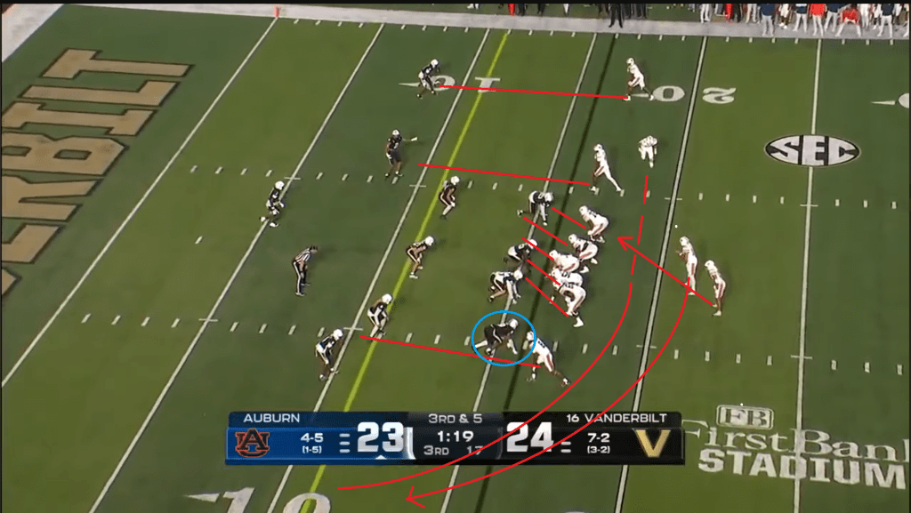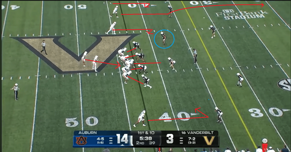 Daniels got the Tigers’ offense one more touchdown with his legs late in the third quarter. This is a good example of incorporating motion into the QB run game. Auburn is just running a basic zone read here, with the tight end coming across to block the overhang player on the playside (the guy who would usually be responsible for tackling the QB). This was a staple of Gus’ offense during the Nick Marshall era, and if you squint a little bit, that #12 might start to look a bit like a #14 here. (Ignore the hold by Preston Howard there, they owed us one after the weak holding call on the last play I showed and Vanderbilt got away with much worse.)