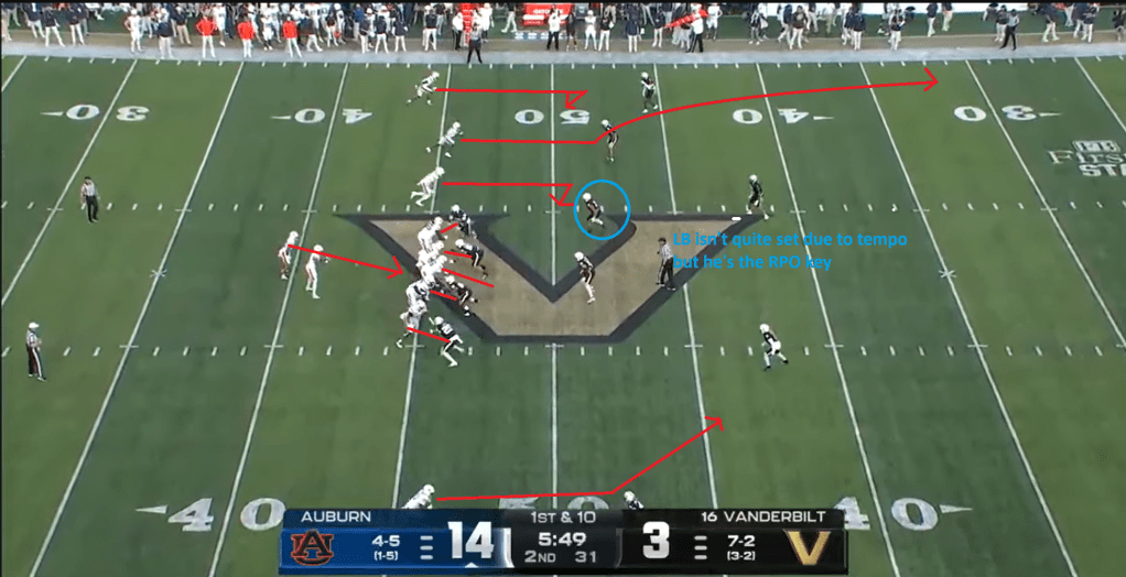 Vanderbilt is a pretty aggressive team on the defensive side of the ball in terms of bringing heat from the second and third levels. If you don’t give their guys in the back seven something to think about, they’ll play aggressively downhill against the run and bring outside linebacker and corner blitzes on you all night. The first example I was going to use to illustrate my point here was the first touchdown of the game, but I realized that this ended up not being much of an RPO because there was no real “option” to read.