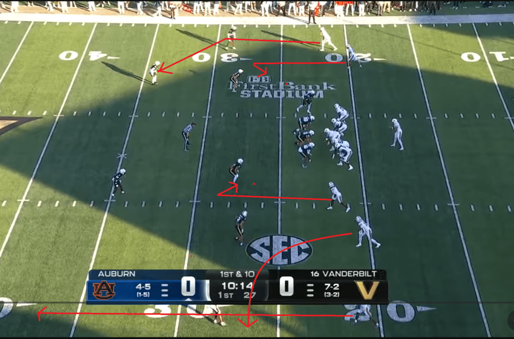 Auburn is in 12 personnel here (boo!) and this kind of illustrates why 12 personnel didn’t work well for this team. Vanderbilt has rolled their safety from the wide side of the field down into the box, and shuffled their safety from the boundary side over to the middle. Auburn is running a zone concept paired with a glance route by Eric Singleton on the boundary side. Usually, Daniels would be reading that boundary safety to hand off or throw the glance, but since he’s rotated to the middle of the field, there isn’t really much to read, and the glance ends up basically being free and it’s an easy touchdown.