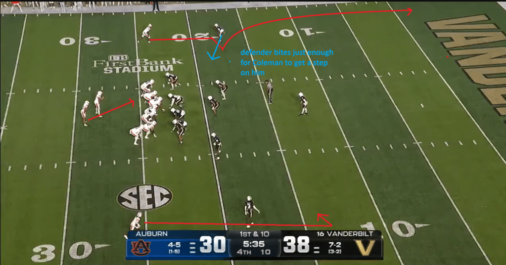 Another good example of play sequencing came on the denouement of that drive, the incredible touchdown catch that Cam Coleman made, followed by the game-tying PAT that sent the game to OT after some baffling coaching decisions by Vanderbilt on their last drive. Auburn had been working that zone/glance RPO I discussed above quite a bit, to the point where the defender who was lined up on Coleman was starting to cheat inside to cut it off. Here, Coleman runs a sluggo route, faking inside before heading up the sideline on a go route. Coleman makes an absolutely otherworldly catch for the touchdown here, but it was set up by great play sequencing to get him just enough separation from the defender to work his magic.