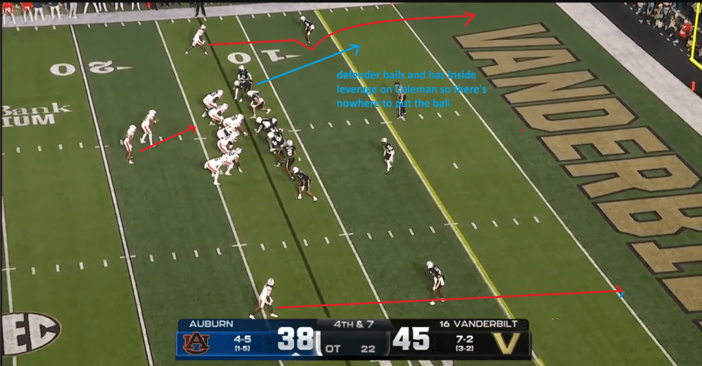 One of the very few playcalls I can really criticize from Derrick Nix was the last play of the game. If it looks familiar, it should, because it’s the exact same play as Auburn’s last touchdown in regulation. Vanderbilt is showing zero blitz before the snap here, but before Auburn checks to the sideline, we see one of the defenders start to peel off to shadow Coleman on the inside. This would’ve been the time to change the playcall and get into something else (although that was a bit limited since Auburn was in 12 personnel here, ahem), but Auburn went ahead with the play and had nothing because it was a one-man route to Coleman, who was bracketed by two defenders and had no chance of making a play even if the ball had been catchable. Old habits die hard, I guess.