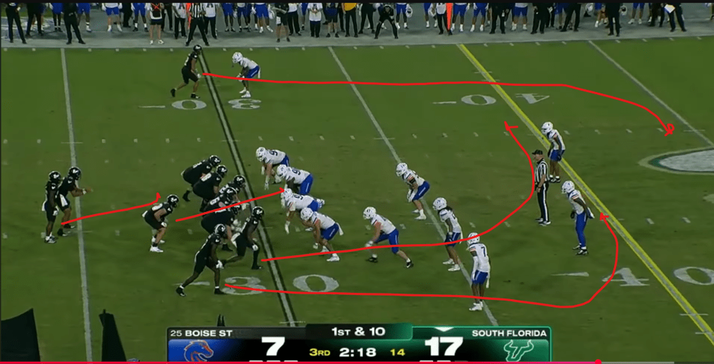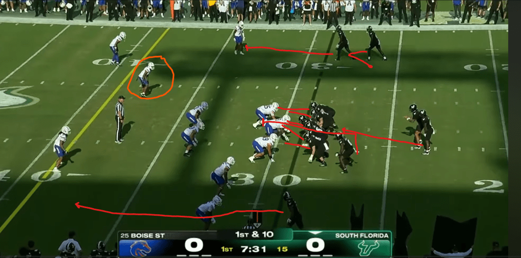 The veer-and-shoot takes spacing to the limit, using all 53.3 yards of the width of the field. This screenshot from USF’s game against Boise in the first week of this season illustrates this well. USF’s outside receivers are lined up almost on the sideline, and even their inside receiver is lined up on the numbers.