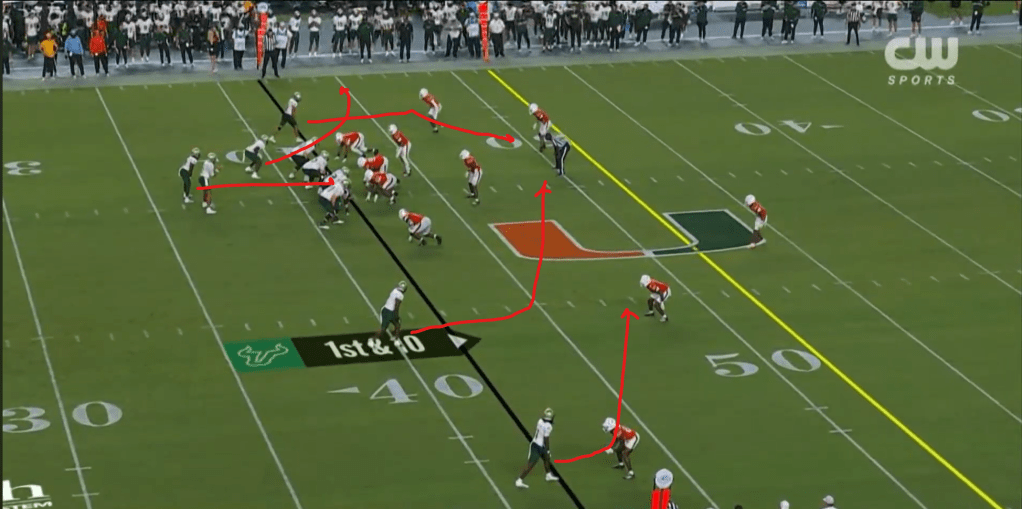 This is a good example of using deep choice routes off of tempo from USF’s game against Miami earlier this year. In this case, they’re running a choice route to the outside receiver at the top of the screen. The inside receiver runs a dig or square-in route designed to occupy the safety, which it does, leaving the outside receiver one-on-one with the CB, and he’s able to beat him deep for a huge gain.